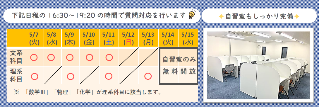 テスト初日の1週間前から『質問対応』+『自習室の開放』を行います。