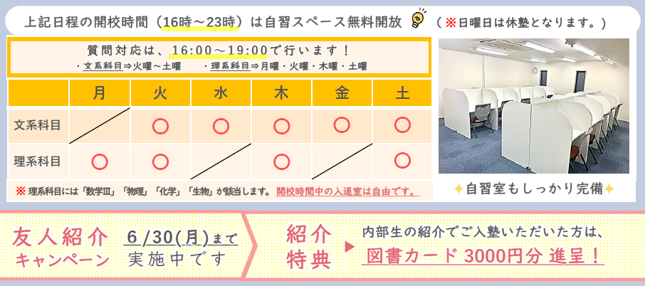 ● 自習室利用:16:00~23:00(開校時間)で利用可能です。