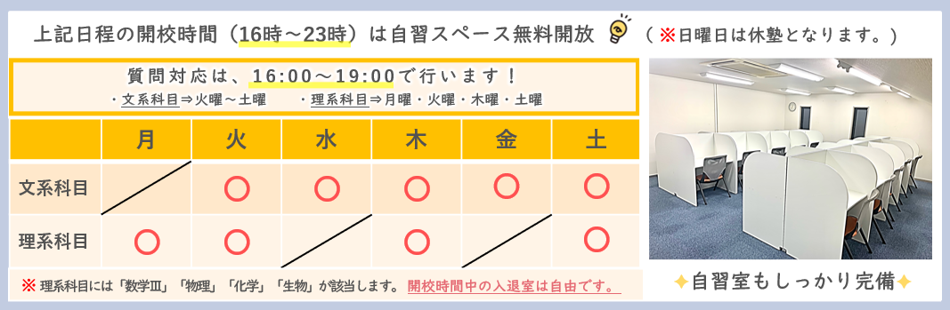 ●自習室 利用可能時間:16:00~23:00〔日曜除く〕